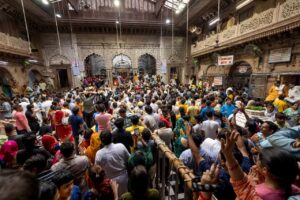 The sewa of the Bihariji is unique in its own way. It is performed in three parts every day ie Shringar, Rajbhog and Shayan. While shringar (which includes bath, dressing and adornment with jewellery like crown and necklaces) and Rajbhog(feast) is offered in the forenoon, Shayan Sewa (shayan means sleep) is offered in the evening. The temple doesn’t have a tradition of Mangala (early morning) sewa. Swami Haridas did not favour Mangla Sewa as he wanted his child like Lord to take complete rest and did not want to disturb him out of deep slumber so early in the morning.